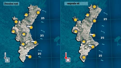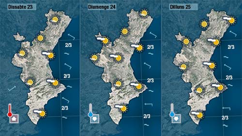 Pense que dissabte serà el dia més calorós. Pujaran lleugerament les temperatures nocturnes i cap a migdia notarem com el mercuri dels termòmetres puja amb més decisió. Cal esperar màximes de 23-25 graus en punt del centre de la Comunitat.