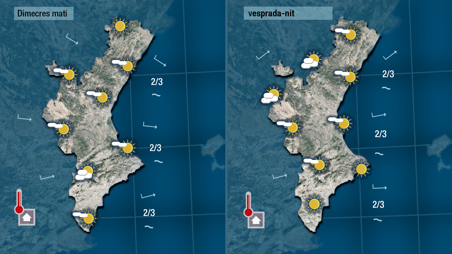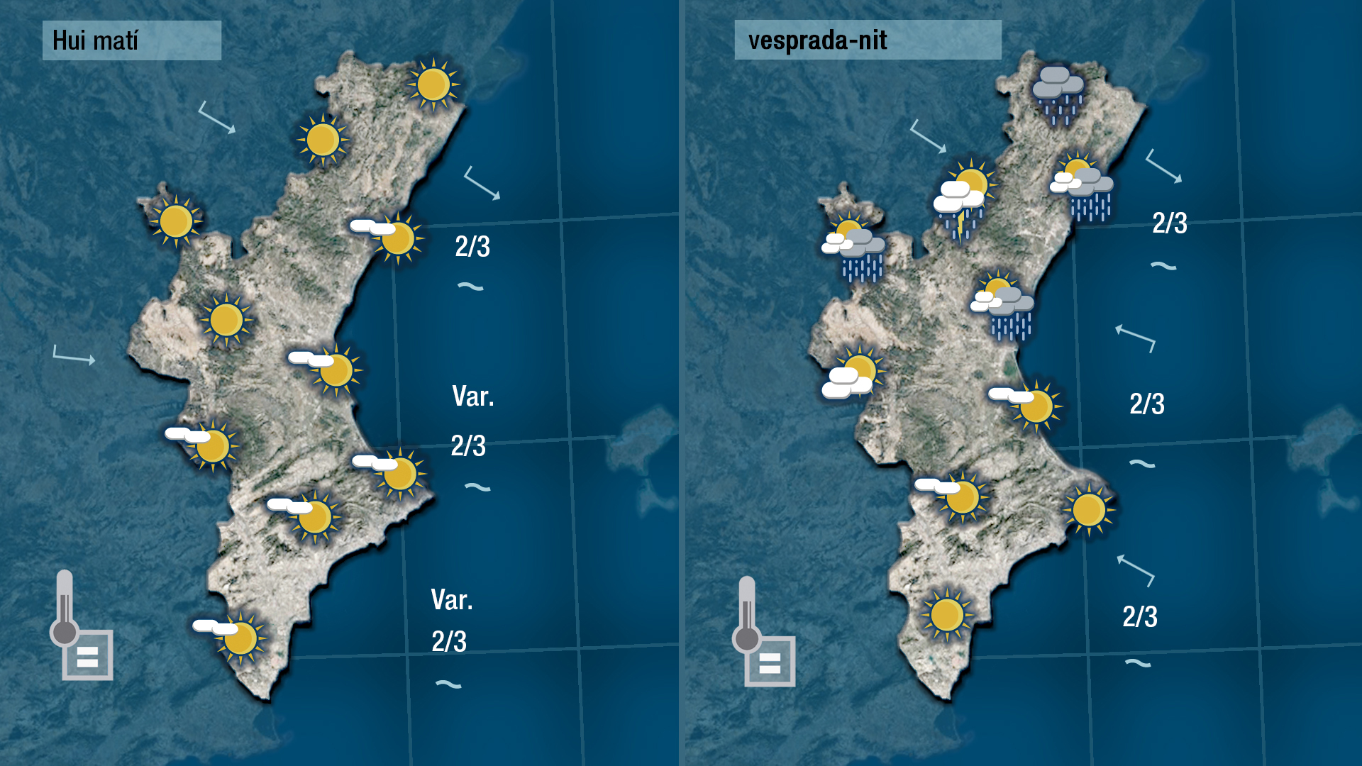 Hui es repetirà més o meys la mateixa seqüència. Tindrem pas de núvols alts durant el matí i caldrà estar atents de nou a les tronades que puguen formar-se al nord de vesprada. Les temperatures no patiran canvis.