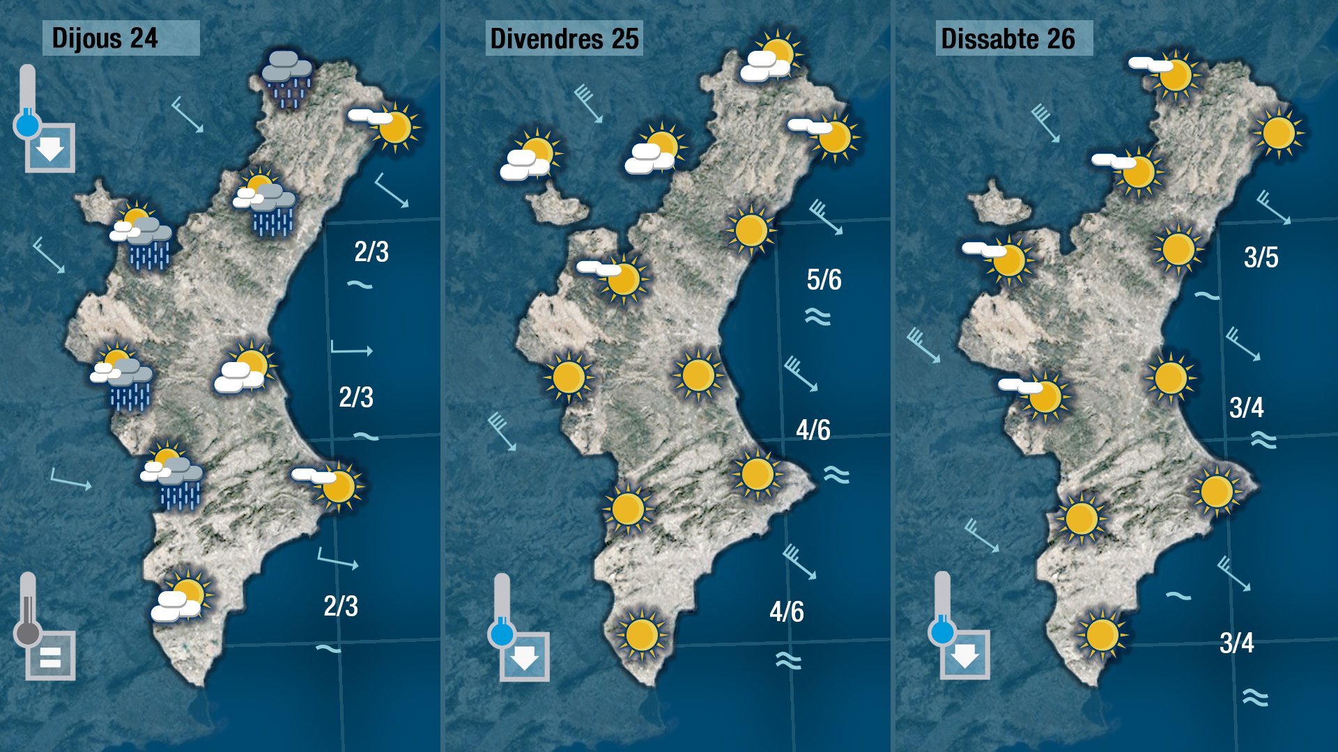 Dijous encara cal esperar un dia prou calorós però a última hora del dia, pot ser durant la vesprada al nord, ens creuarà un front augmentarà la nuvolositat i es registraran pluges dèbils. Serà el tret d’eixida als canvis que notarem a partir de divendres i que tot indica que es mnatindran el cap de setmana.