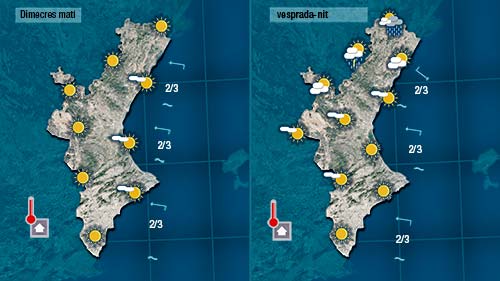 Pocs canvis per a demà. Pot ser puguem vore alguns núvols a la costa en començar el dia i de vesprada per l’interior amb temperatyres que tornaran a pujar un o dos graus tant de nit com de dia.