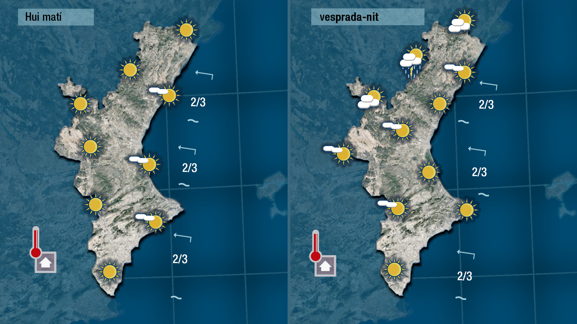 I hui, tret d’algun núvol que uga créixer amb més energia a les muntanyes del nord a partir de migdia oprimera hora de la vesprada que puntualment puga deixar algun ruixat tornem a tondre un dia dominat pel sol amb perspectives de que faça més calor que ahir.