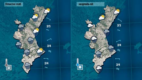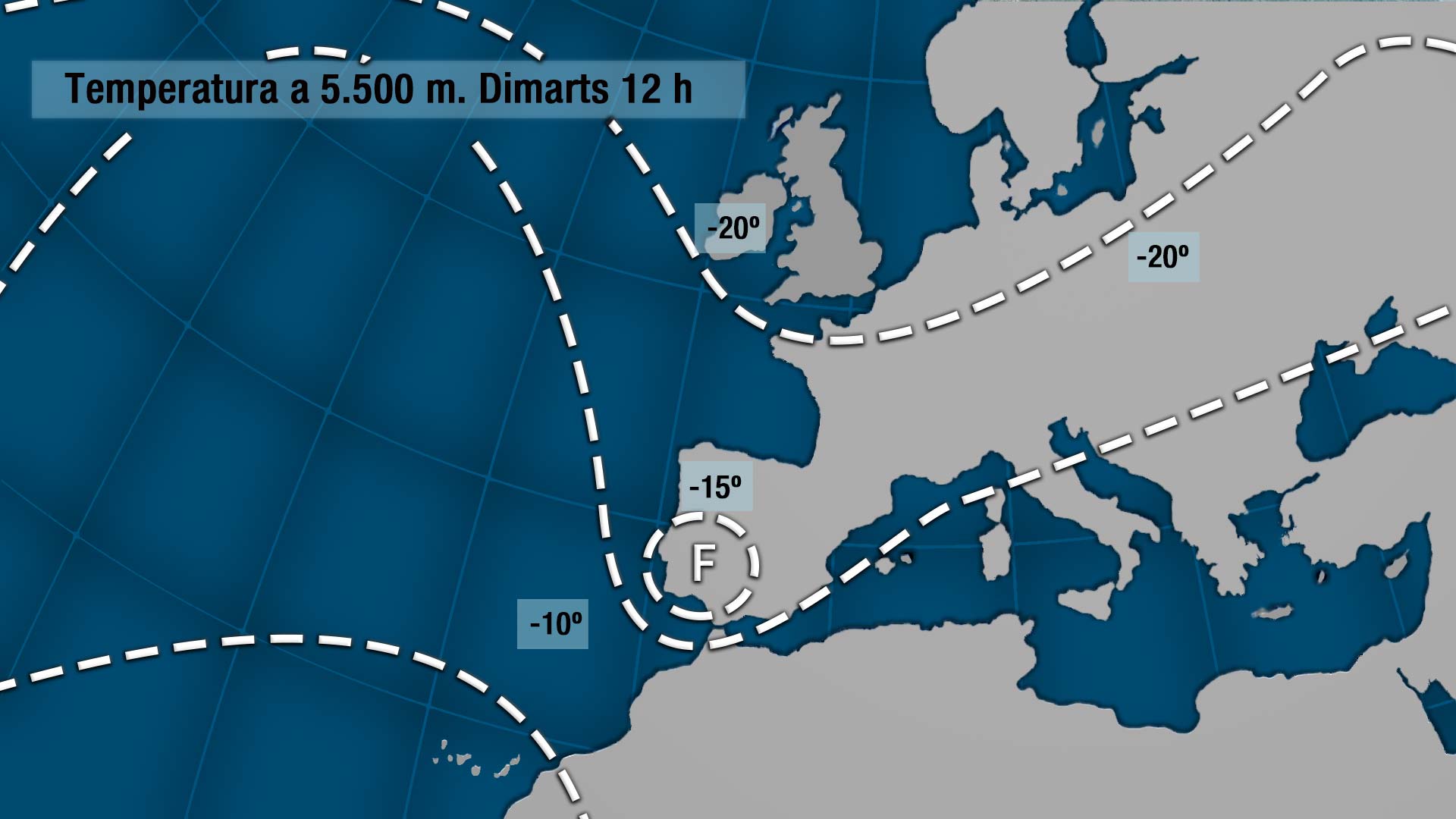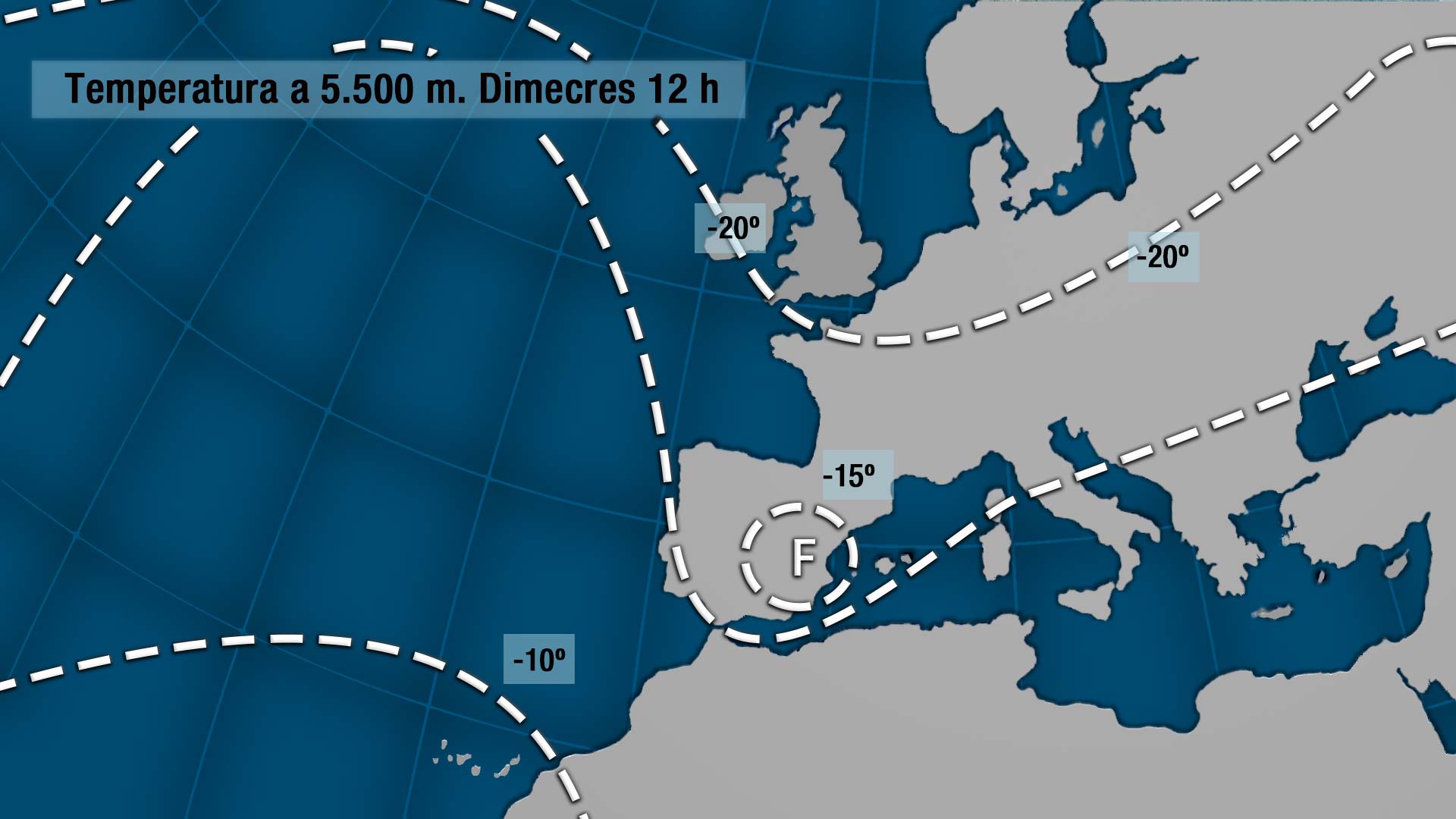 Serà demà dimecres a migdia quan ens creuarà el fred en altura (una glopadeta d’aire fred a uns 5.500 metres d’altura entre 10 i 15 graus per davall de zero) que pot ser només deixarà pluges ala mitad sud de la Comunitat, però localment podrà ploure amb intensitat moderada o forta.