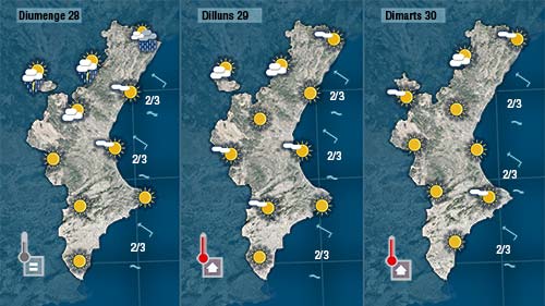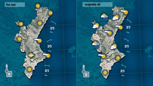 El dia començaà assolellat i amb pocs canvis en les temperatures però pense que esta vesprada el cel quedarà més cobert en punts de l’interior on localment podrà arribar a caure alguna gota. Les temperatures marcaran valors semblants als d’ahir.
