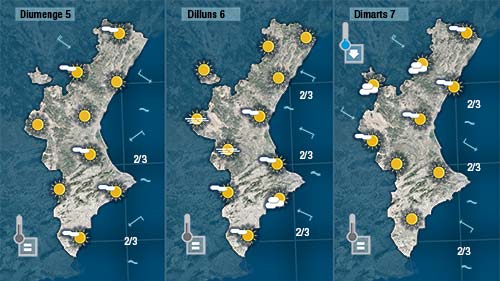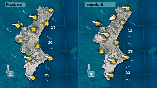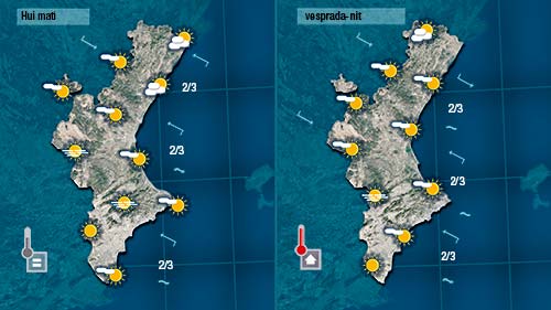 Hui encarà tindrem que esperar fins amigdia per poder disfrutar del sol. El matí és i serà fresc però pensem que esta vesprada les temperatures podran pujar lleugerament. A migdia notarem l’entrada del mestral al nord i durant la nit i matínada també es deixarà sentir a la resta de la Comunitat.