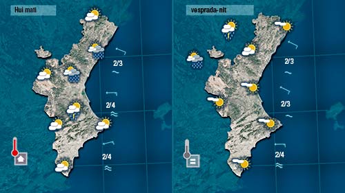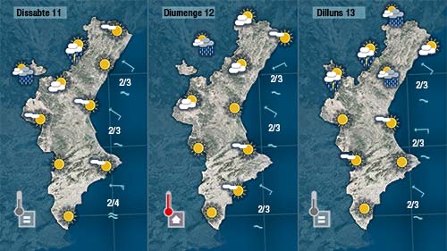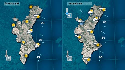 Demà divendres vorem núvols baixos de matí a la costa i de vesprada podrà formar-se alguna tronada a les rodalies del sistema ibèric on podrien baixar lleugerament les temperatures.
