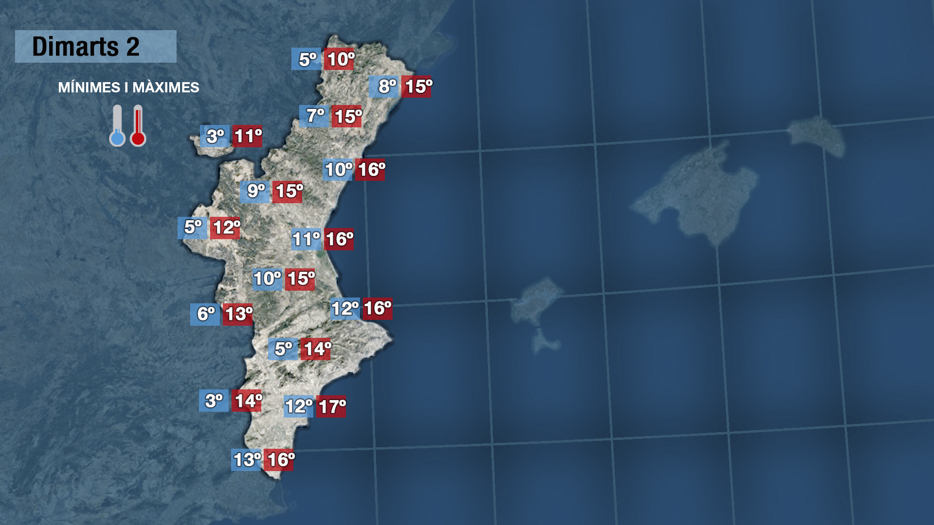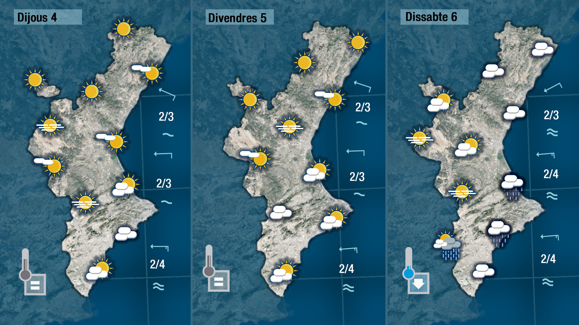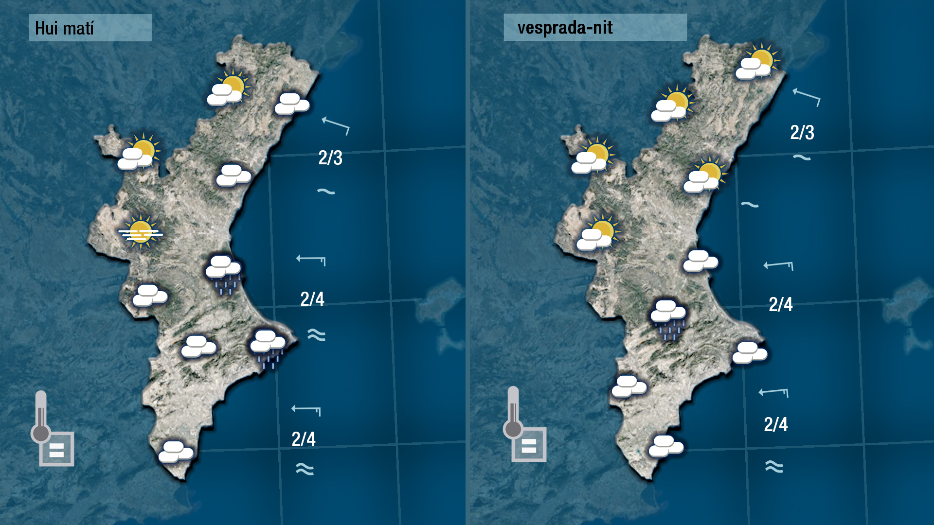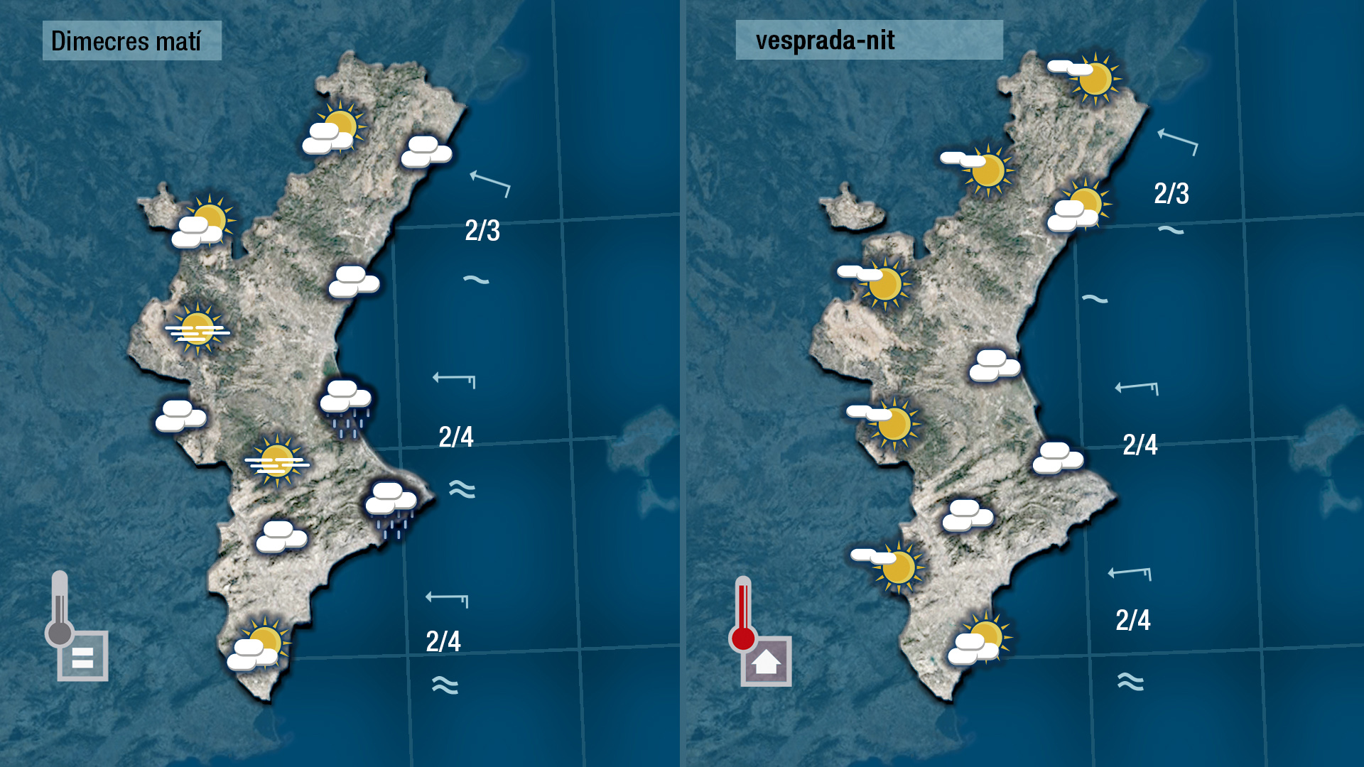 Pense que demà dimecres podrem vore més el sol. Encara podria escapar-se algun ruixat en punts de la costa del sud de València i del nord d’Alacant fins a migdia però a poc a poc s’imposarà el sol i això afavorirà un lleuger ascens de les temperatures.