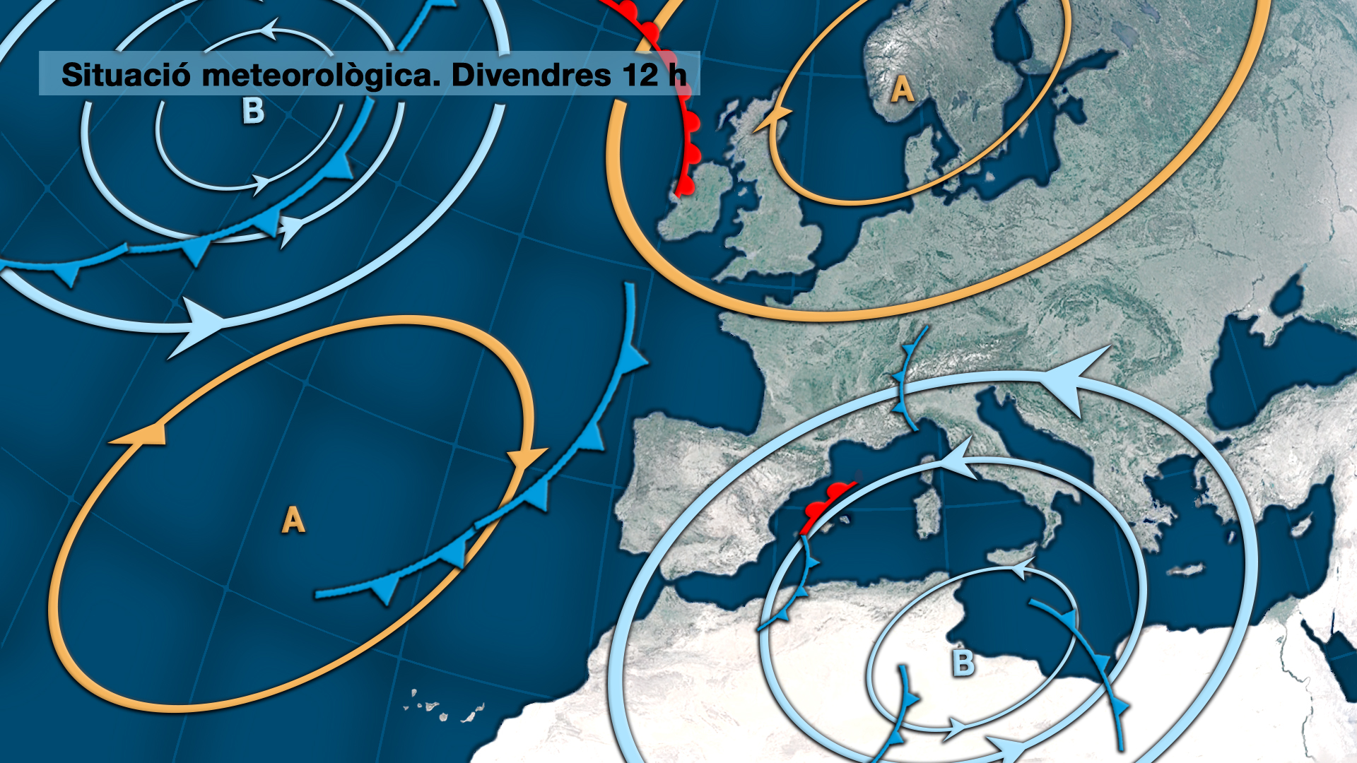 Les altes pressions van des de Escandinàvia fins a l’Atlàntic impedint l’arribada de borrasques des de l’oest però confina les baixes pressions al mediterrani on estan donant pluges torrencials al nord d’Itàlia i impulsen vents de llevant cap a nosaltres.