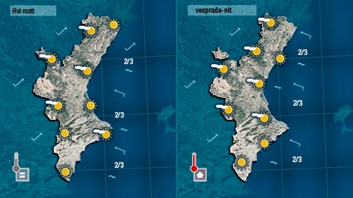 Amb pocs núvols al cel i amb vent de llebeig les temperatures acabaran pujant lleugerament respcete les d’ahir. A la costa trobarem una lluita engtre el llebeig i el xaloc que pensem que acabarà guanyant els vent del sud-est.