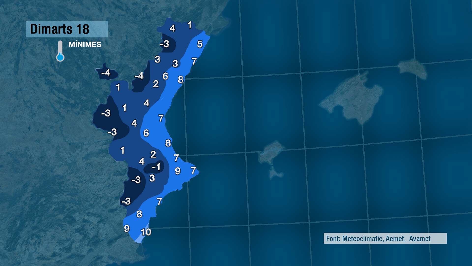 La nit ha sigut ben fresca, amb gelades generals per l’interior que localment han tocat sectors del centre de la Comunitat i amb temperatures per davall dels 10 graus a la costa.