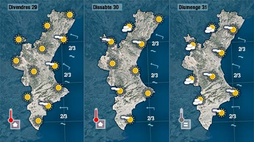 Demà dijous començarem el dia amb el cel més ennuvolat. No descarte que puga arribar a caure alguna gota en punts costaners de València i del nord d’Alacant però en cap cas seran pluges importants. De fet, a patir de migdiaespamparà la nuvolositat, i acabarà imposant-se el sol encara que les temperatures no experimentaran variacions.