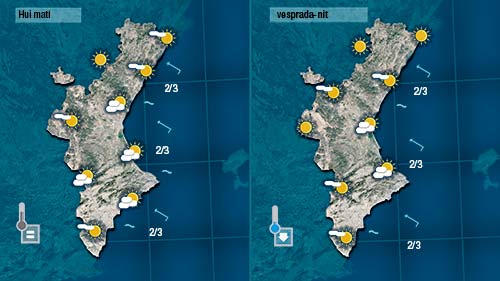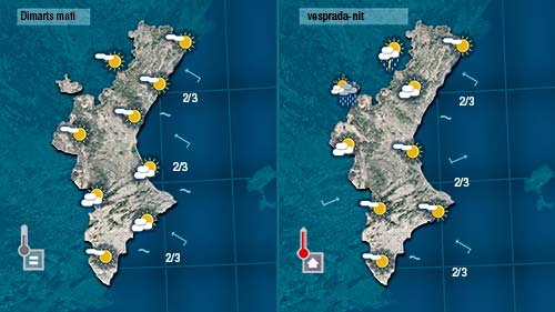 Demà dimarts cal estar atents de nou al ponent perquè es eixara sentir  ala mitad sud de la Comunitat fent pujar de nou les temperaures entre els 30 i 33 graus allà on més pugen. De vesprada no es descarta que puguen créixer nuvols d’evolucioó a les zones de muntanya del nord.