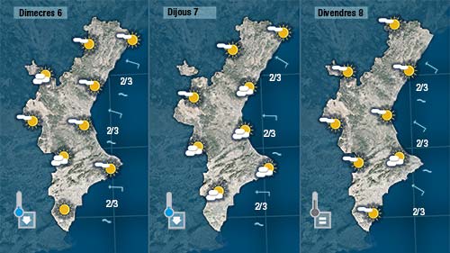 La setmana començarà amb pocs canvis. Pot ser les temperatres diürnes baixen lleugerament a la costa on durant tot el dia cal esperar més núvols i vent d’origen marítim que sempre refresca més.