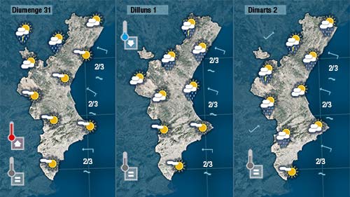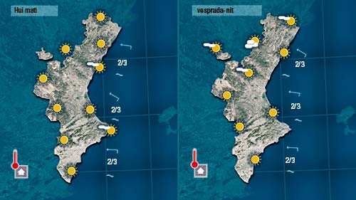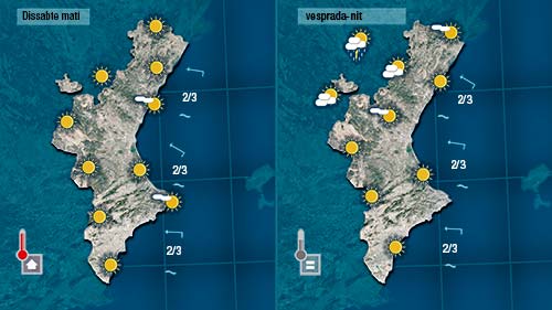Demà dissabte notarem com pugen lleugerament les temperatures nocturnes mentre que les diürnes no patiran canvis. A les muntanyes d’Aragá creixeran algun núvol amb més energia però difíciment arribaran a tocar la Comunitat Valenciana.