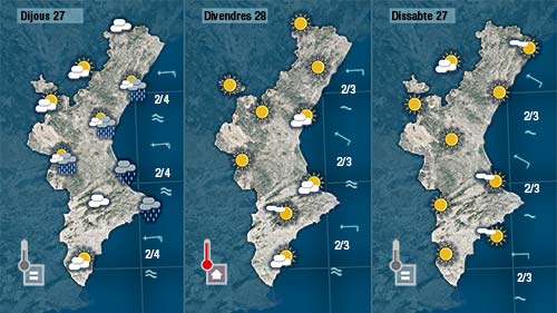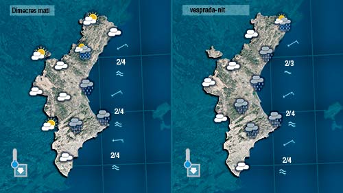 Demà dimecres es reforça el llevant que aportarà núvols a tota la franja costanera deixant pluges prou generals. Tenim el dubte de fins on arribarà la pluja perquè en estes situacions a voltes es resisteix a endinsar-se i les comarques del nord, de l’interior i del sud reben poca pluja. Les temperatures encara baixaran un poc més.