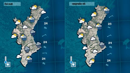 Pense que les precipitacions que puguen registrar-se hui no seran molt abundants i pot ser tampo siguen massa generals, però en esta època de l’any tampoc podem descartar res, i en punts de la costa del sud de València i del nord d’Alacant localment podria ploure amb intensitat moderada i amb persistència.