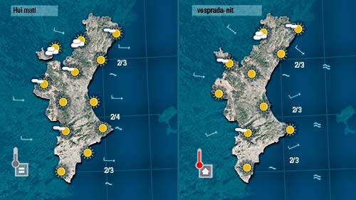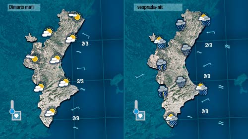 Demà dimarts começarem el dia pendents dels ruixat i les tronades que amb moltra probabilitat acabaran afectant bona part d ela comunitat. Fins a migdia encara podrem vore el sol però els núvols seran cada volta més abunants i segurament el dia no s’acomiadarà sense donar pluges ala major part d ela Comunitat. Les temperatures paturan un anotable maixada, d’entre 3 i 5 graus a la major part d’observatoris.