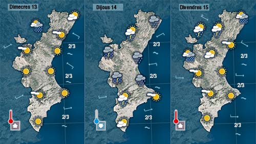 Divendres i pensem que el cap de setmana vorem de nou més el sol i pujaran les temperatures, però caldrà estar atents als ruixats que puguen registrar-se a la mitad sud de la Comunitat i que haurem de confirmar els pròxims dies.