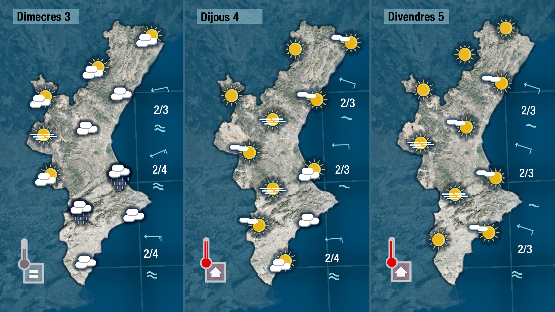 Dimecres encara començarem el dia amb núvols baixos i boires però pense que cap a migdia i de vesprada podrem vore un poc més el sol.