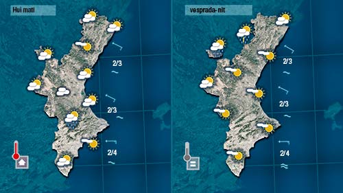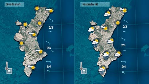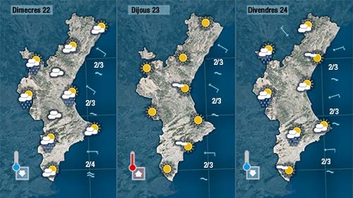 L’augment de la nuvolositat durant la matinada de dimarts a dimecres ens deixarà un dia gris, més fresc i amb oluges dèbils la primera part de dimecres. De vesprada escamparà quedant el cel ras dijous. I tot indica que divendres tornarem a tindre més núvols i alguns ruixats.