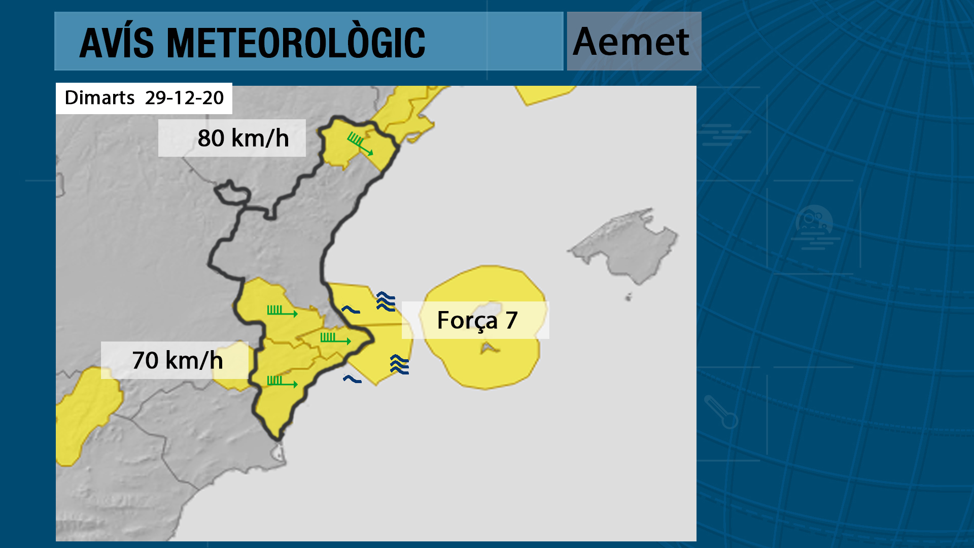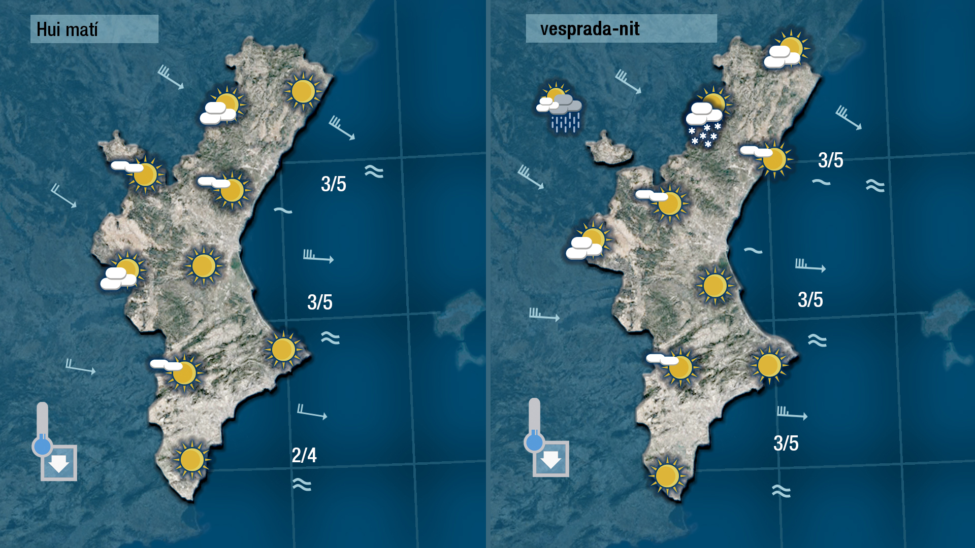 El vent encara es deixarà sentir hui amb força tant al nord com al sud de la Comunitat. Aemet manté l’avís grog al nord fins a migdia i a l’interior sud de València i a Alacant fins a la mitjanit. A la mar encara cal esperar ones de més de tres metres en mar oberta al sud de València i a la zona costanera d’Alacant.