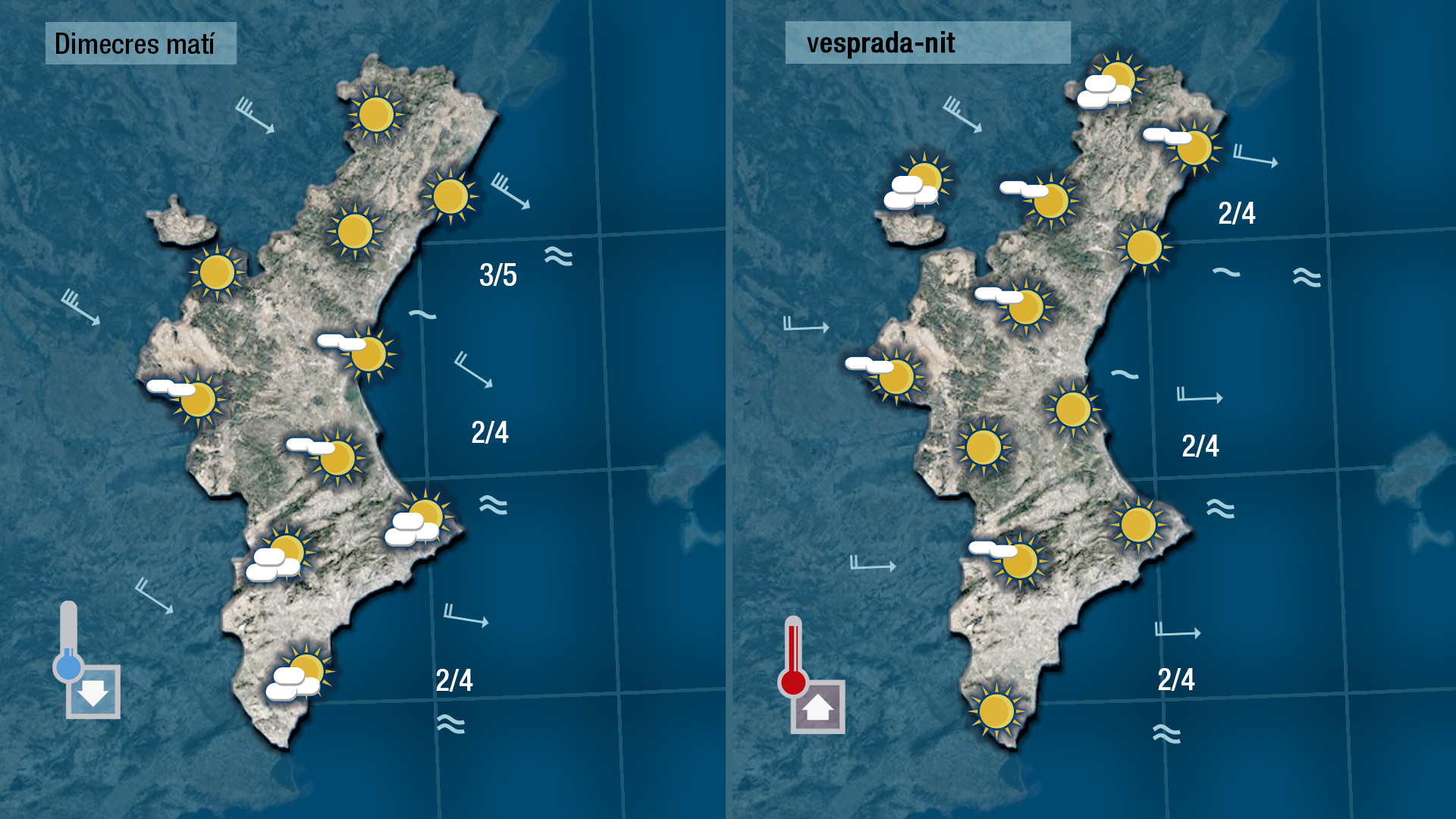 Demà dimecres les ratxes de vent més fortes cal esperar-les al nord on el mestral encara donarà ratxes entre els 70 i els 80 Km/h. Les temperatures nocturnes baixaran lleugerament i les diurnes podran pujar un o dos graus.