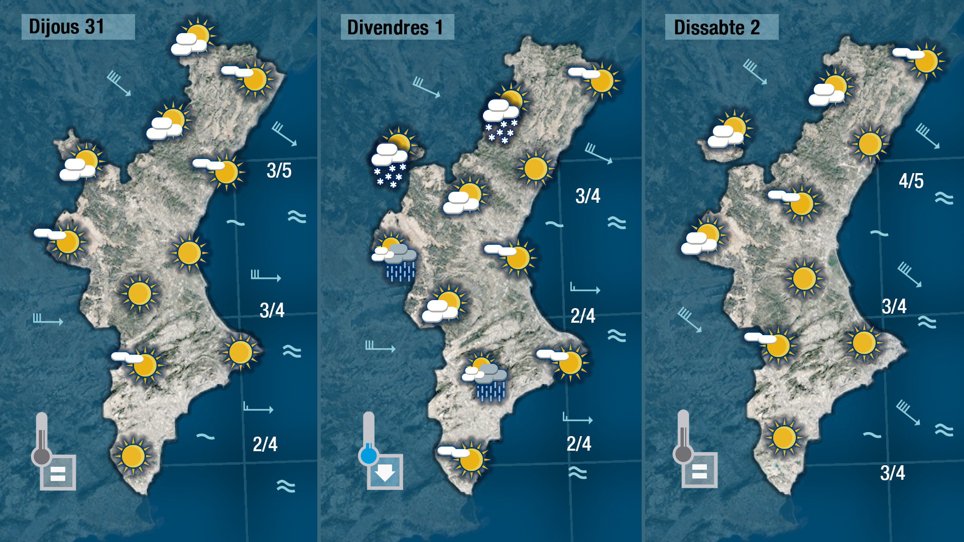 Dijous tancarem el 2020 amb vent però amb pocs núvols al cel i les temperatures no patiran grans canvis, però la benvinguda a l’nay nou serà més freda i amb més núvols que de forma puntual podran deixar ruixats al nord i per l’interior amb una cota de neu que podria baixar fins als 900 metres.
