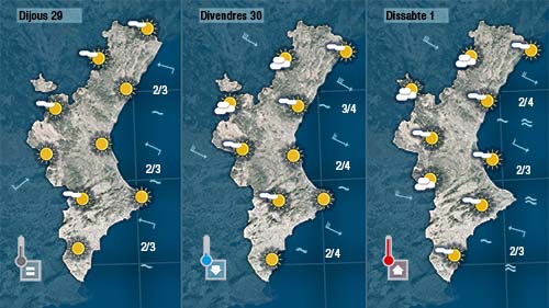Dijous també serà un dia de calma. Assolellat i amb temperatures molt suaus, sense canvis. A última hora notarem com augmenta la nuvolositat anunciant el pas d’un front que durant la matinada de dijous a divendres que podrà deixar ruixats dèbils i dispersos i tornarà a obrir la porta al mestral provocant un nou descens de les temperatures tot i que a prtir de mig matí el sol s’imposarà per tot arreu