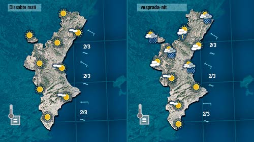 Demà dissabte tornarà a repetir-se més o menys la meteixa seqüència. Un matí assolellat i calorós vindrà seguit d’una vesprada més inestable, amb ruixats i tronades al nord que a última hora de la vesprada o a poqueta nit podran acabar afectant punts del centre i de la costa de Castelló i de València.
