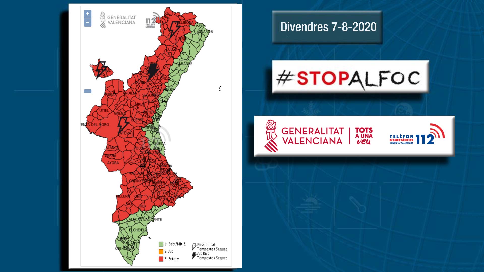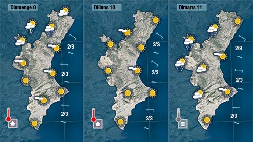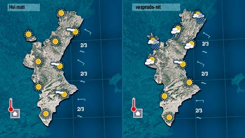 Un dia assolellat fins que comencen a formar-se nuvolades d’evolució a partir de migdia al nord. La previsió dona tronades a les muntanyes del nord per a esta vesprada i amb l’ascens de les temperatures el color roig (nivell extrem) per risc d’incendis es fa general a la major part de la Comunitat.