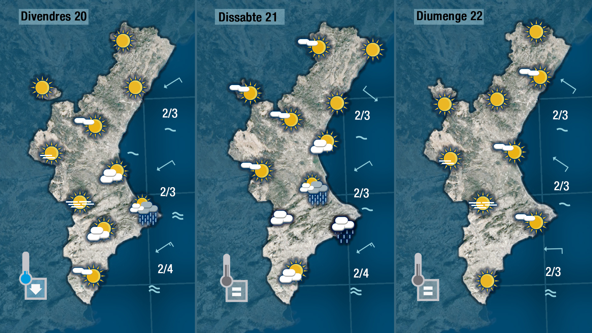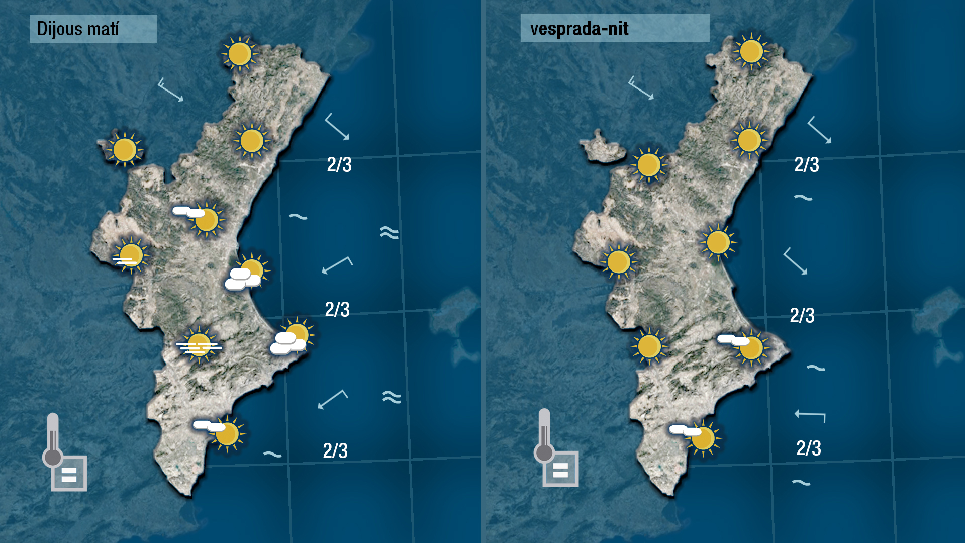 Demà dijous tindrem més núvols al sud, on bufarà gregal més humit que al nord on el mestral sempre és més sec. Les temperatures n patiran canvis baixaran al nord i per l’interior però pujaran a la costa on acabarà deixant la seua emprempta el vent de component oest.