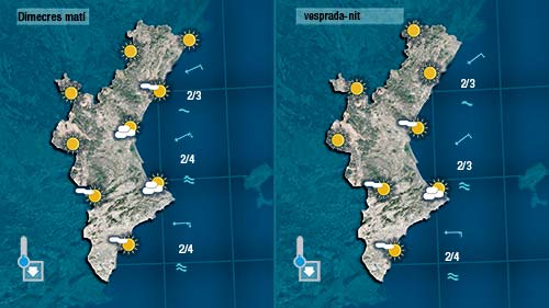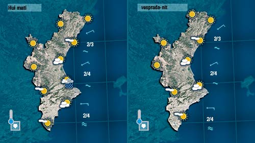 Serà el que podrà registrar-se hui en punts de la costa del sud de València i del nord d’Alacant: alguns ruixats dèbils i dispersos (apenes marcar els carrers en punts de La Marina i La Safor). Pot ser la diferència més acusada entre l’oratge d’ahir i el de hui siga el descens de les temperatures (entre 3 i 5 graus a la major part d’observatoris)