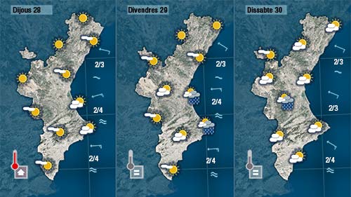 Dijous pujaran lleugerament les temperatures per mantindre’s sense canvis o baixar lleugerament a partir de divendres quan el cel estarà més cobert i fins i tot i tot podria arribar a ploure dèbilment.