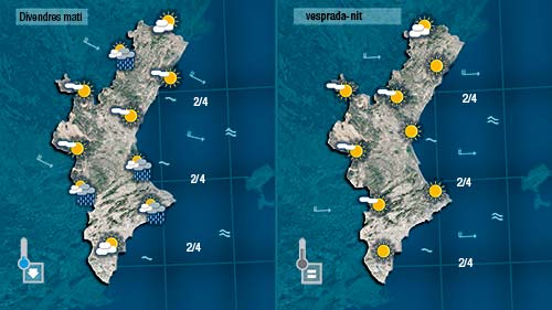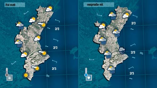 De l’oratge de hui cal esperar xicotets canvis respecte al d’ahir: tindrem més núvols que desfilant des de l’interior cap a la costa deixaran ruixats dèbils i dispersos. No obstant, a poqueta nit haurem d’estar atents al gir dels vents a gregal perquè podria ‘alimentar’ els núvols i donar algun ruixat de més entitat al litoral d ela mitad sud de la Comunitat. Les temperatures baxiaran un parell de graus.