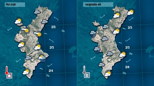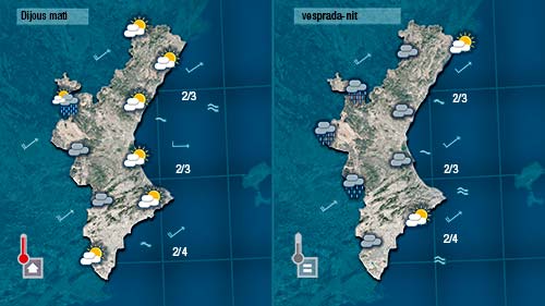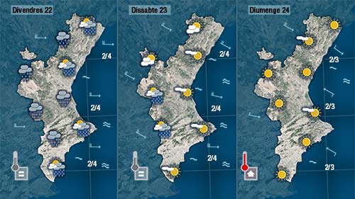 Divendres la probabilitat de pluja serà major. Durant el matí podrem vore un poc el sol i la la possibilitat de pluja encara serà baixa però de vesprada els núvols entraran amb més activitat des de l’interior diexant ruixats a la major part de la Comunitat ( sempre més quantiosos en punts de l’interior i del nord).