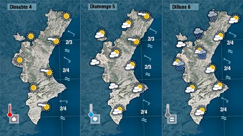 Sembla que per fi tindrem uns dies sense pluja. No estem davant d’una situació d’estabilitat absoluta però sembla que fins diumenge podrem vore més el sol i no s’espera que ploga però el final del cap de setmana serà més fresc i la setmana que ve pot ser la nuvolositat serà més abunant amb pluges dèbils i alguna tronada per l’interior.