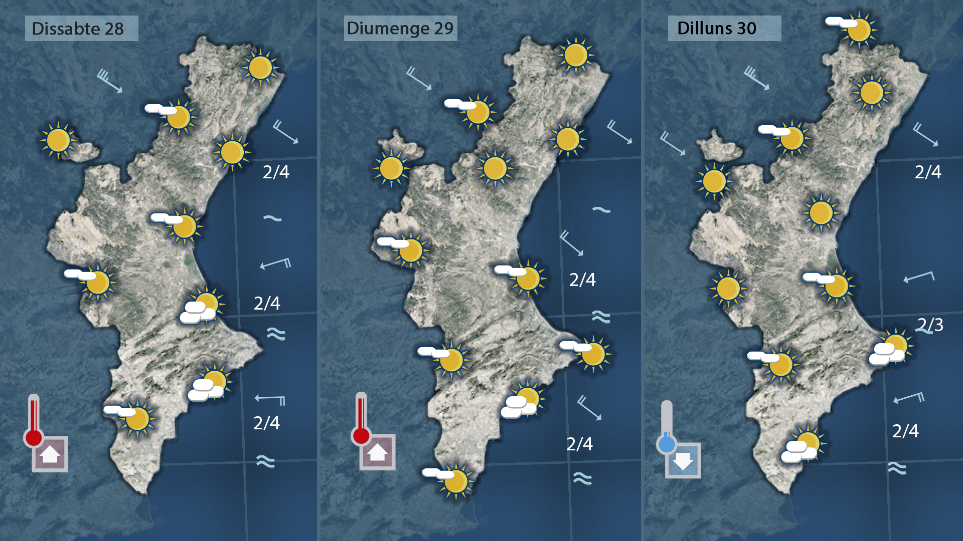 El cap de setmana es recupetraran lleugerament les temperatures mentenint-se el mesytral al nord i el gregal al sud.