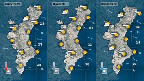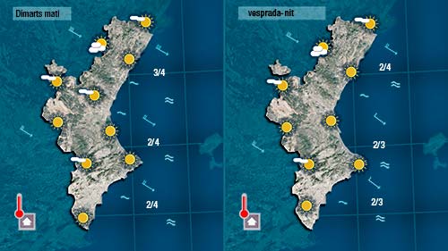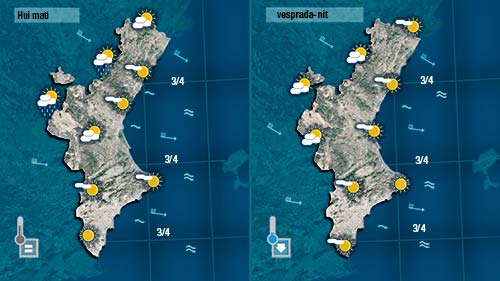 Acompanyant els vent tindrem més núvols al nord, on a primera hora i fins a mig matí podrà ploure dèbilment però de forma continuada. Al centre i al sud també vorem alguns núvols que de tant en tant deixaran el cel parcialment cobert, però serà molt difícil que arriben a donar pluja.