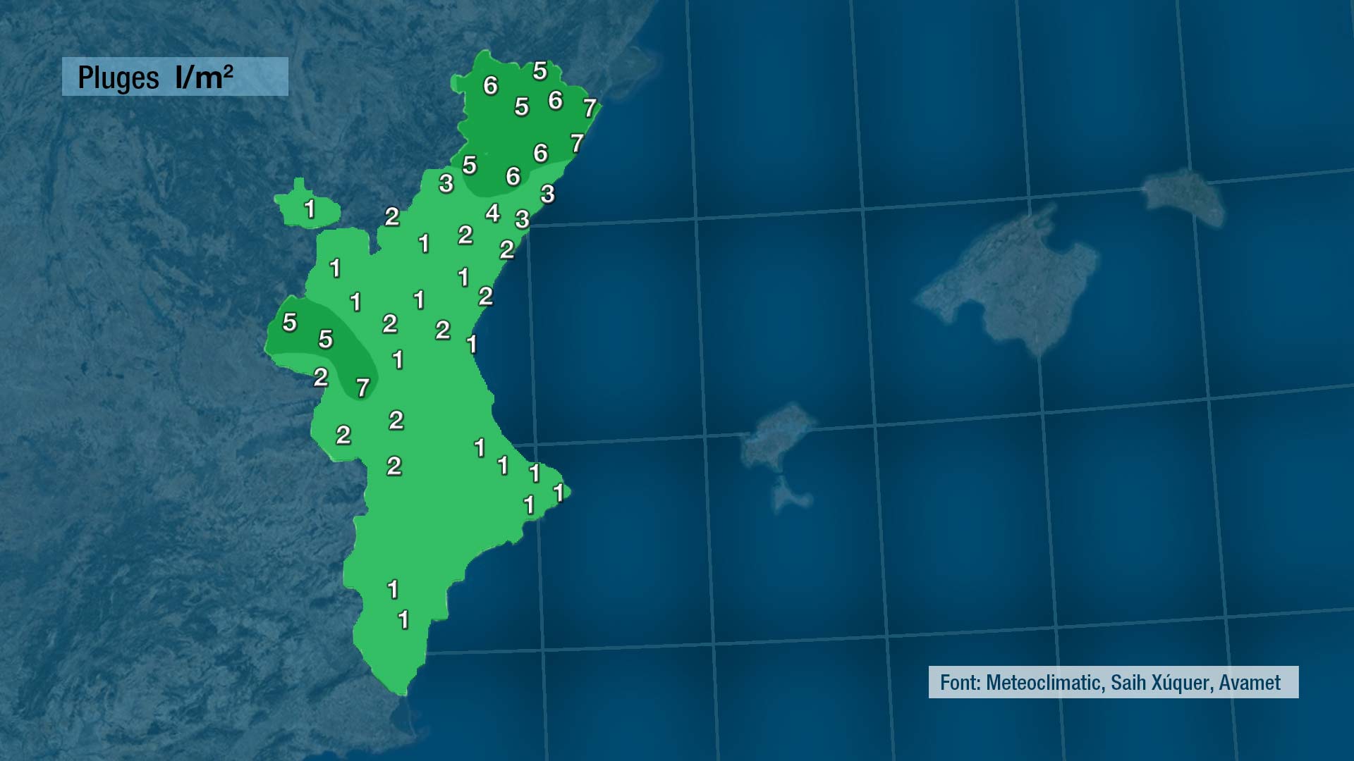 En este mapa podeu vore les precipitacions aportades pel front de núvol que ens ha creuat esta nit