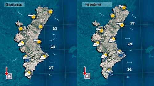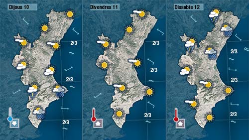 Els núvols i la pluja estaran presents a la mitad sud de la Comunitat fins al migdia de dijous. Pel nord entrarà el mestral fent baixar les temperatures que divendres tornarien a pujar de foma notable.