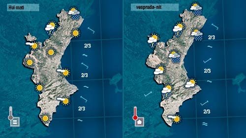 Hui serà el sol qui predomine a primera hora del dia però no tardarem a vore senyals de trons en punts de muntanya. Si van cumplint-se les previsions amb l’exactitud d’ahir cap a migdia escoltarem els primers trons a les muntanyes de Castelló i cauran les primeres pluges que de vesprada avançaran cap al centre i posteriorment cap a la costa.