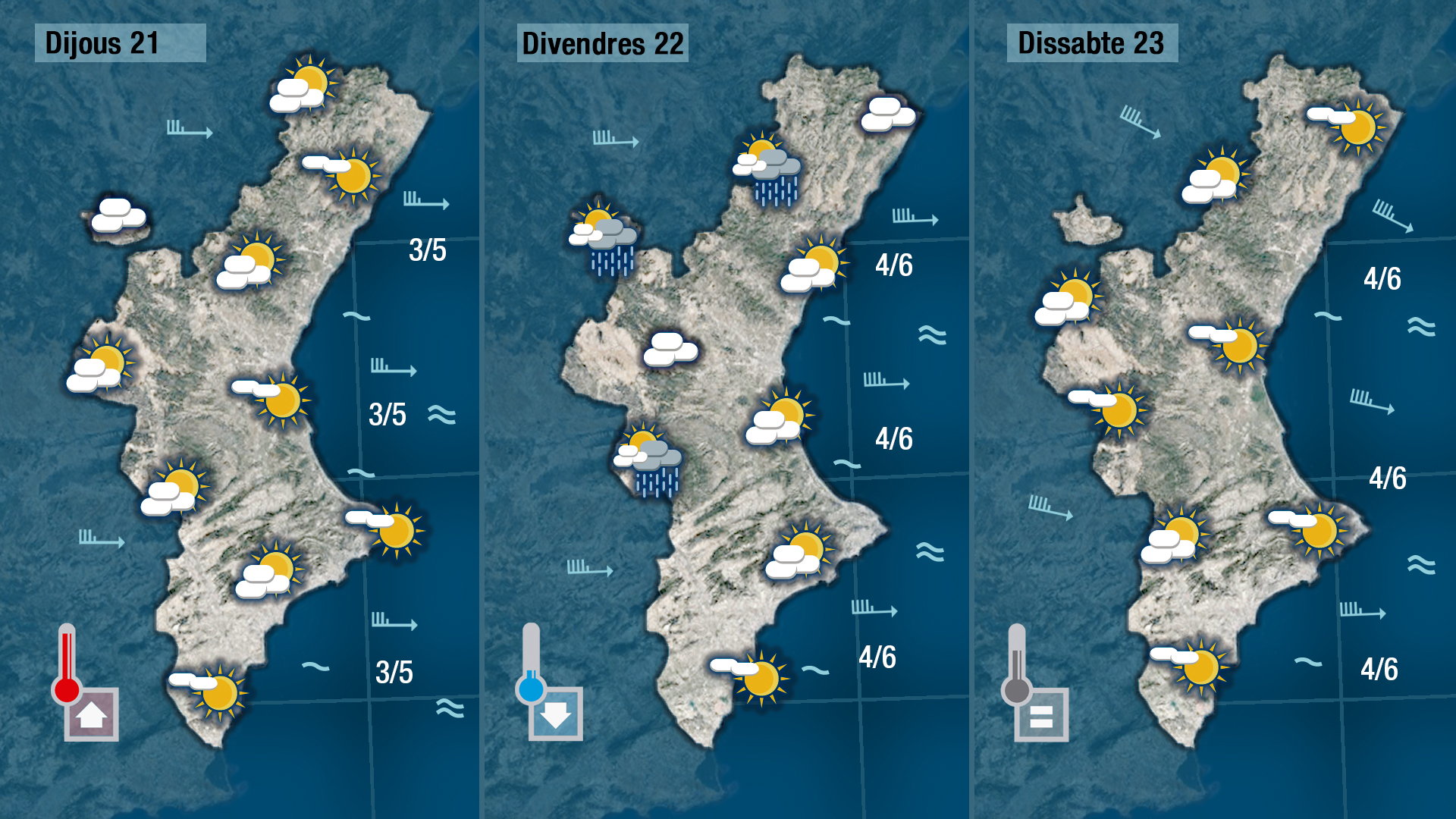Encetarem dijous un periode amb vents de ponent i oas de núvols que divendres podrien deixar ruixat cap a a migdia. Dijous els termòmetres tornaran a marcar 20 graus a les zones més pròximes a la costa, i encara que divendres baixaran un poc es mantindran suaus.