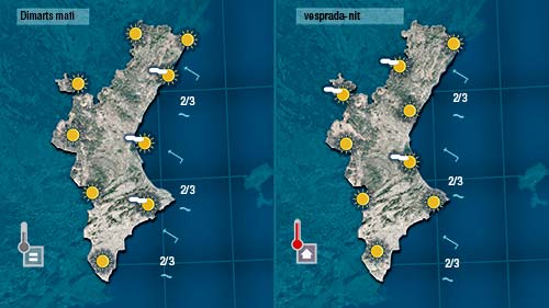 Demà dimarts el dia començarà amb temperatyres lleugerament més baixes però al centre del dia les temperatures pujaran de de nou de forma notable (sobretot al centre i per l’interior)