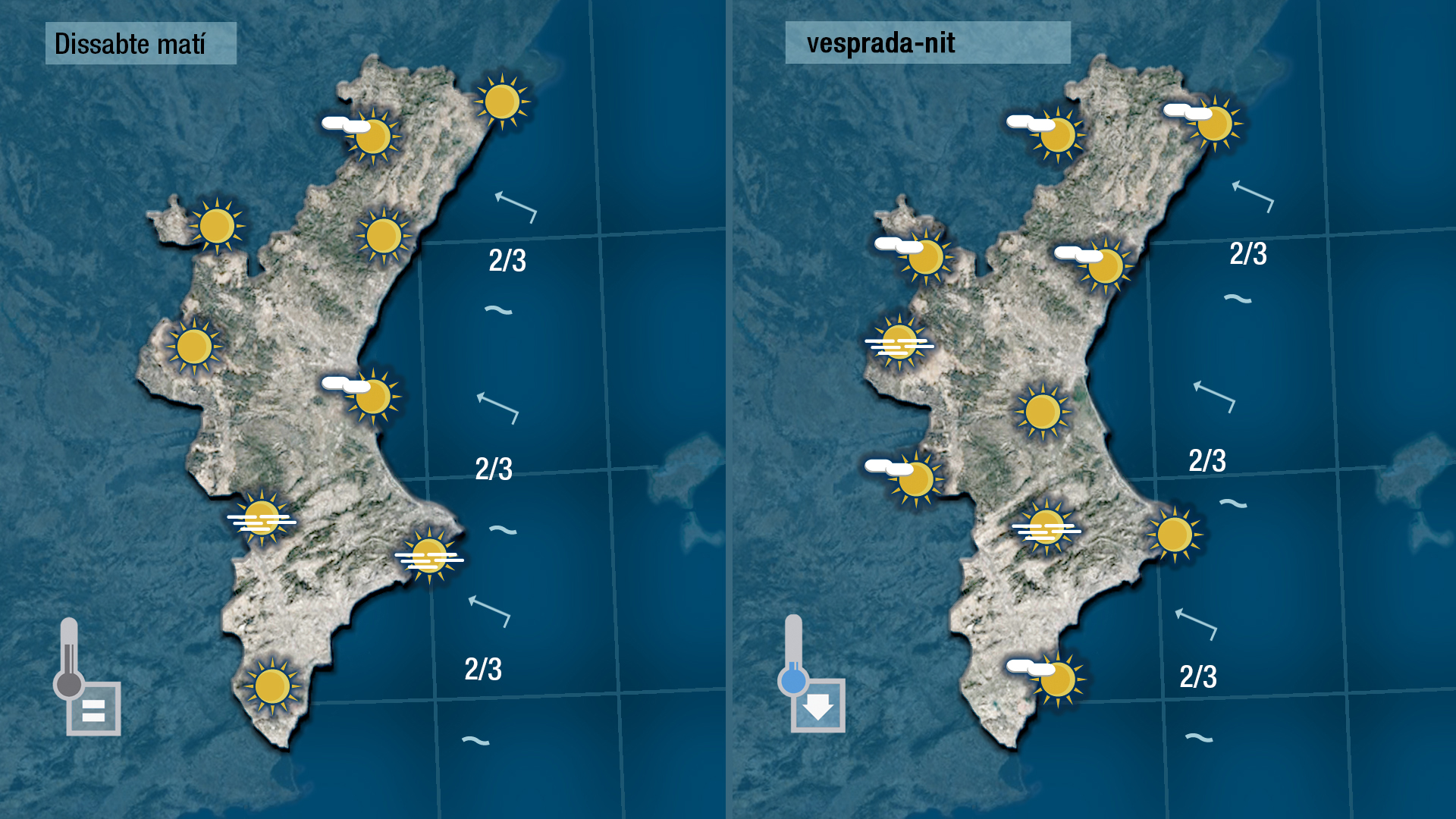 La probabilitat que es formen boires, tant a primera com a última hora del dia, torna a ser hui elevada. Junt ales boires el dia serà calitjóx i la visibilitat quedarà reduïda. Les temperatures tendiran a pujar al centre del dia