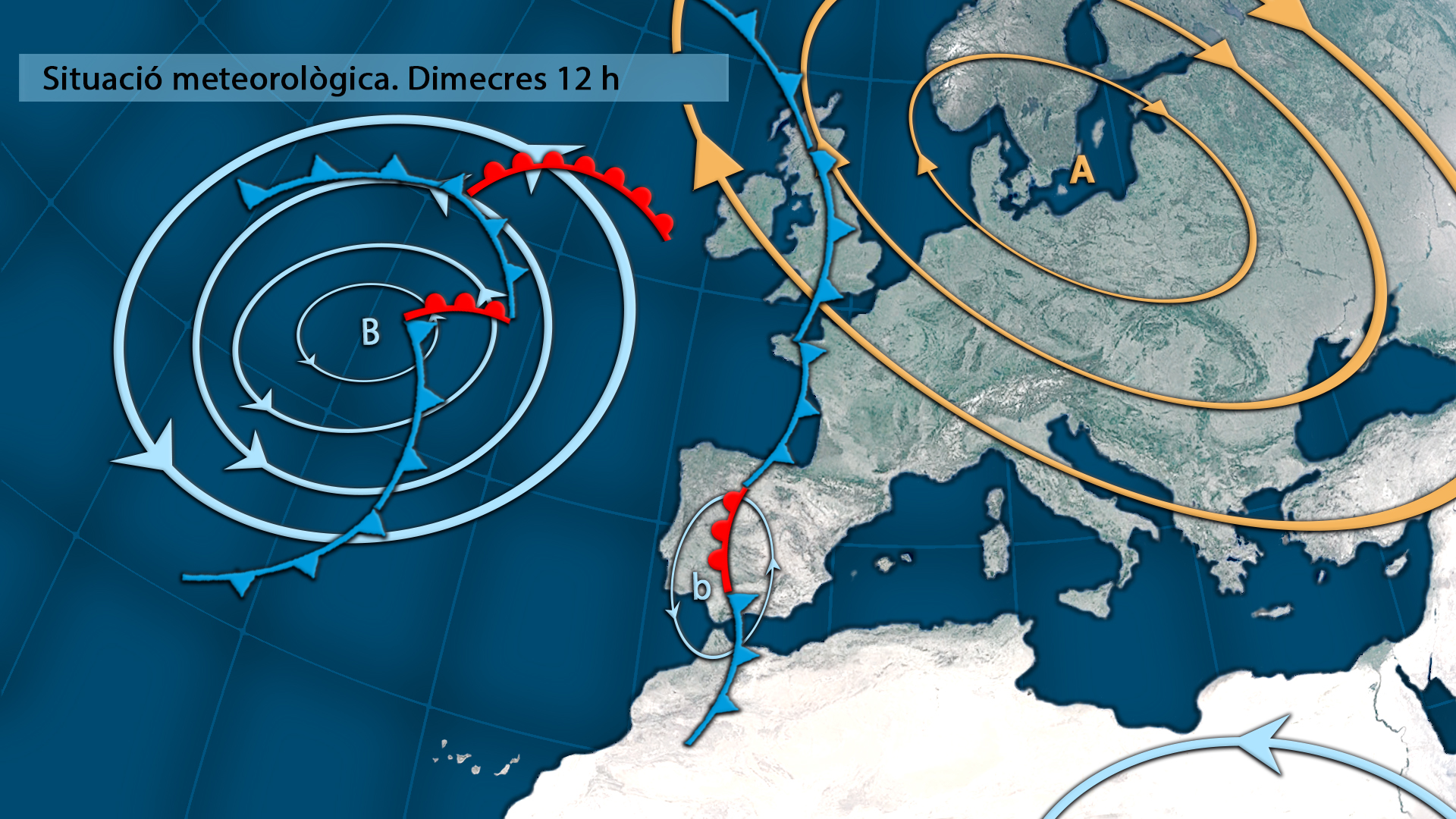 L’anticicló al centre i nord-est d’Europa actuant de bloqueig. La borrasca a l’Atlàntic enviant-nos fronts de núvols que només deixen algo de profit a l’oest de la Península. I nosaltres al mig amb un oratge més bé tirant a avorrit i monòton