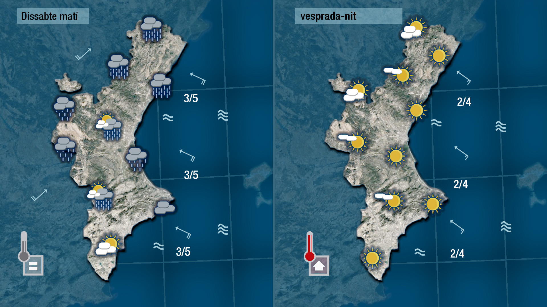 Dissabte de matí encara estarà el cel cobert o parcialment cobert a gran part del territori. No serà fins a migdia quan comence a escampar de forma més efectiva afavorint un lleuger ascens de les temperatures.