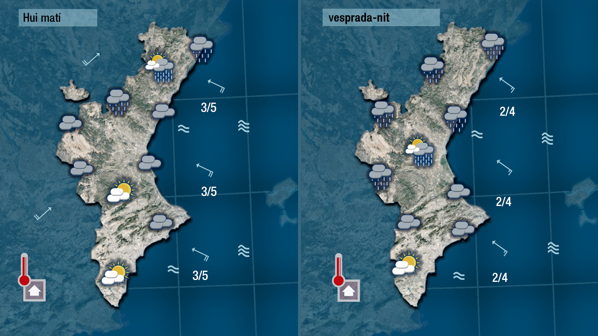 Hui encara cal esperar ruixats dèbils i esporàdics. Seran més probables i abundants de vesprada on al nord i a l’interior de Castelló encara podran deixar quantitats importants de pluja.