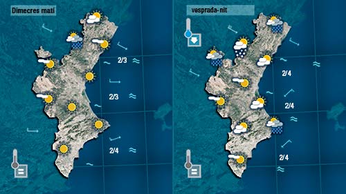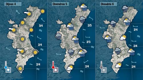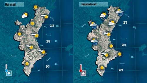 Els núvols avançaran cap al sud al llarg de la vesprada, i a poqueta nit, en girar el vent a gregal al sud podria ploure en punts de la costa de València i del nord d’Alacant. Un descens de les temperatures acompanyarà al pas de núvols de nord a sud.