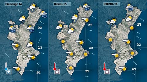 Fins diumenge a migdia l’oatge serà molt variable a la mitd nord on podran registrar-se ruixats de distribució i intensitat molt desigual. Alguns podrien ser en forma de tempesta. Si van cumplint-se els previsions escamaria de vesprada. El descens de les temperatures serà notable diumenge (les màximes quedaran al voltantd els 28-29 graus a la costa i només un poc per damunt dels 30 allà on més pugen)