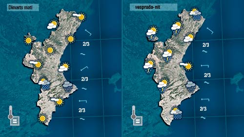 Demà dimarts també tindrem més sol de matíque de vesprada quan les vesprada quan les tronades sembla que fins i tot seran més generals i localment descarregaran més pluja que les que puguen formar-se hui.