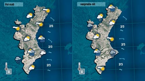 El dia ha començat amb sol o pocs núvols al nord i nuvolositat més abunant al sud on no descarte ruixats dèbils. Esta vesprada haurem d’estar atents als núvols de temspesta que es formaran en punts de muntanya i que a poqueta nit podran tocar punts de la costa de La Marina i La Safor.